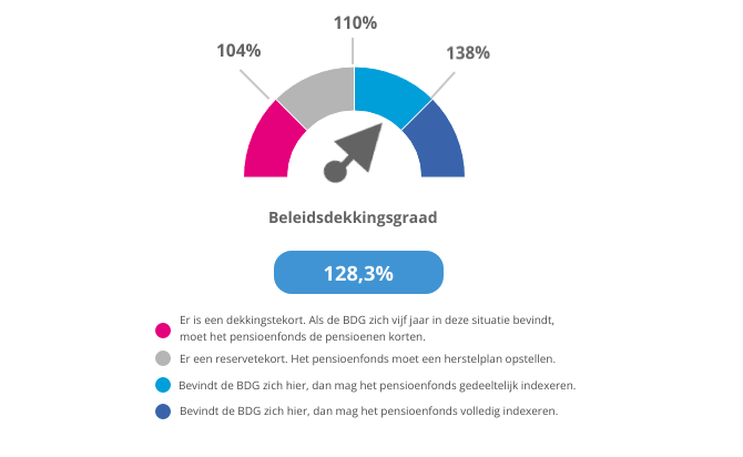 Het pensioenfonds berekent maandelijks de DNB-dekkingsgraad (DG). Dit is een maatstaf voor de financiële positie van het pensioenfonds. Daarnaast wordt ook elke maand de Beleidsdekkingsgraad (BDG) berekend. Dit is het voortschrijdende gemiddelde van de laatste 12 dekkingsgraden. De BDG is belangrijk voor het toezicht door De Nederlandsche Bank (DNB) en is mede bepalend voor het toeslagbeleid.