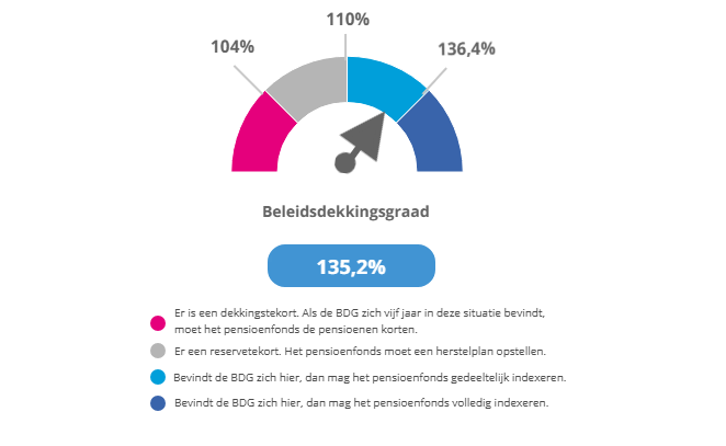 De beleidsdekkingsgraad is het gemiddelde van de actuele dekkingsgraden over de afgelopen twaalf maanden. Onze beleidsdekkingsgraad kwam eind november uit op 135,2% (oktober: 134,4%). Deze dekkingsgraad is bepalend voor het besluit tot verhoging van de pensioenen. Wilt u meer weten over ons toeslagbeleid? Kijk dan op deze pagina.