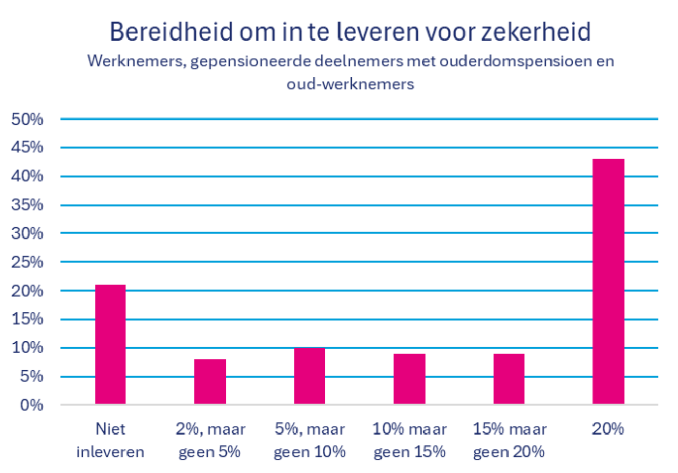 21% wil liever kans op de maximale verhoging (ongeveer even hoog als de inflatie), en neemt het risico dat de verhoging soms lager is voor lief. De rest van de deelnemers aan het onderzoek blijkt bereid om tussen 2 en 20% indexatie in te leveren, als ze in ruil daarvoor zekerheid krijgen over die jaarlijkse verhoging.