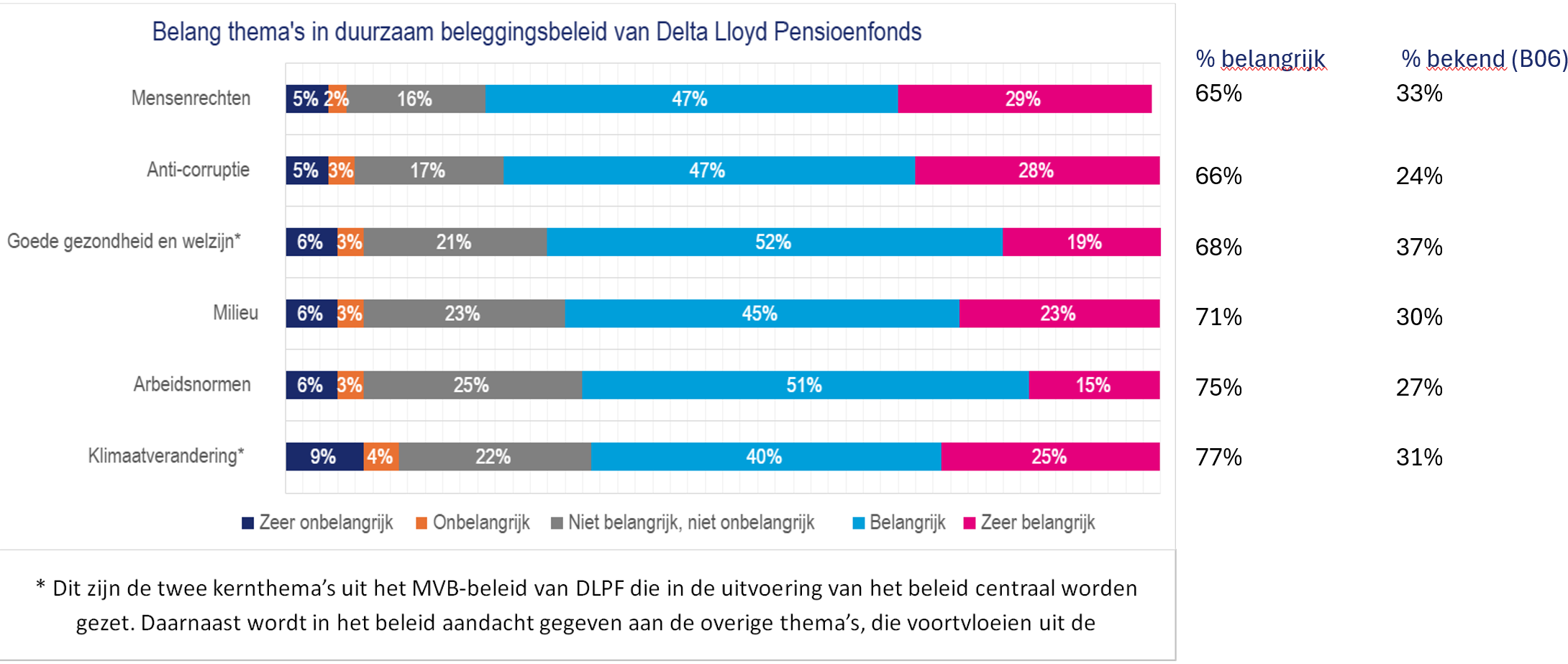 Ongeveer de helft van de deelnemers aan het onderzoek vindt het belangrijk dat Delta Lloyd Pensioenfonds duurzaam voor hen belegt. Maar slechts een derde vindt dat duurzaam beleggen mag leiden tot een minder stabiel rendement op korte termijn. Volgens het beleid voor maatschappelijk verantwoord beleggen (MVB) van het fonds zijn de belangrijkste thema's 'klimaatverandering' en 'goede gezondheid en welzijn'. Onze deelnemers vinden die thema's ook belangrijk, maar noemen 'mensenrechten' en 'anti-corruptie' als meest zwaarwegende thema's.