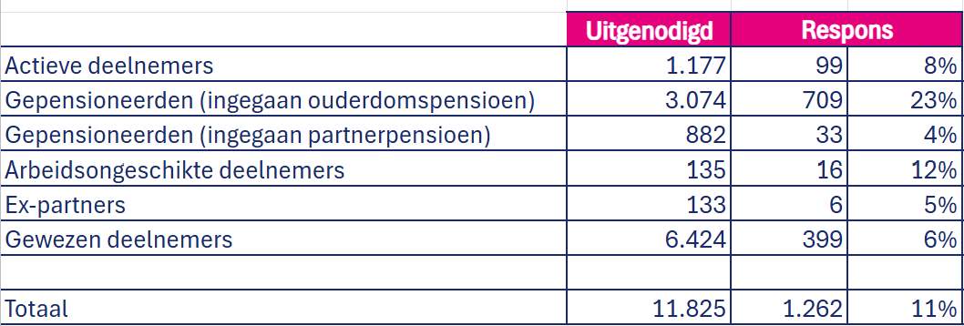 De online enquête kon worden ingevuld van 4 tot en met 31 augustus. In totaal hebben 1.262 deelnemers (inclusief gepensioneerden en ex-partners) deze vragenlijst ingevuld. Dat is ongeveer 11% van al onze deelnemers (11.825).